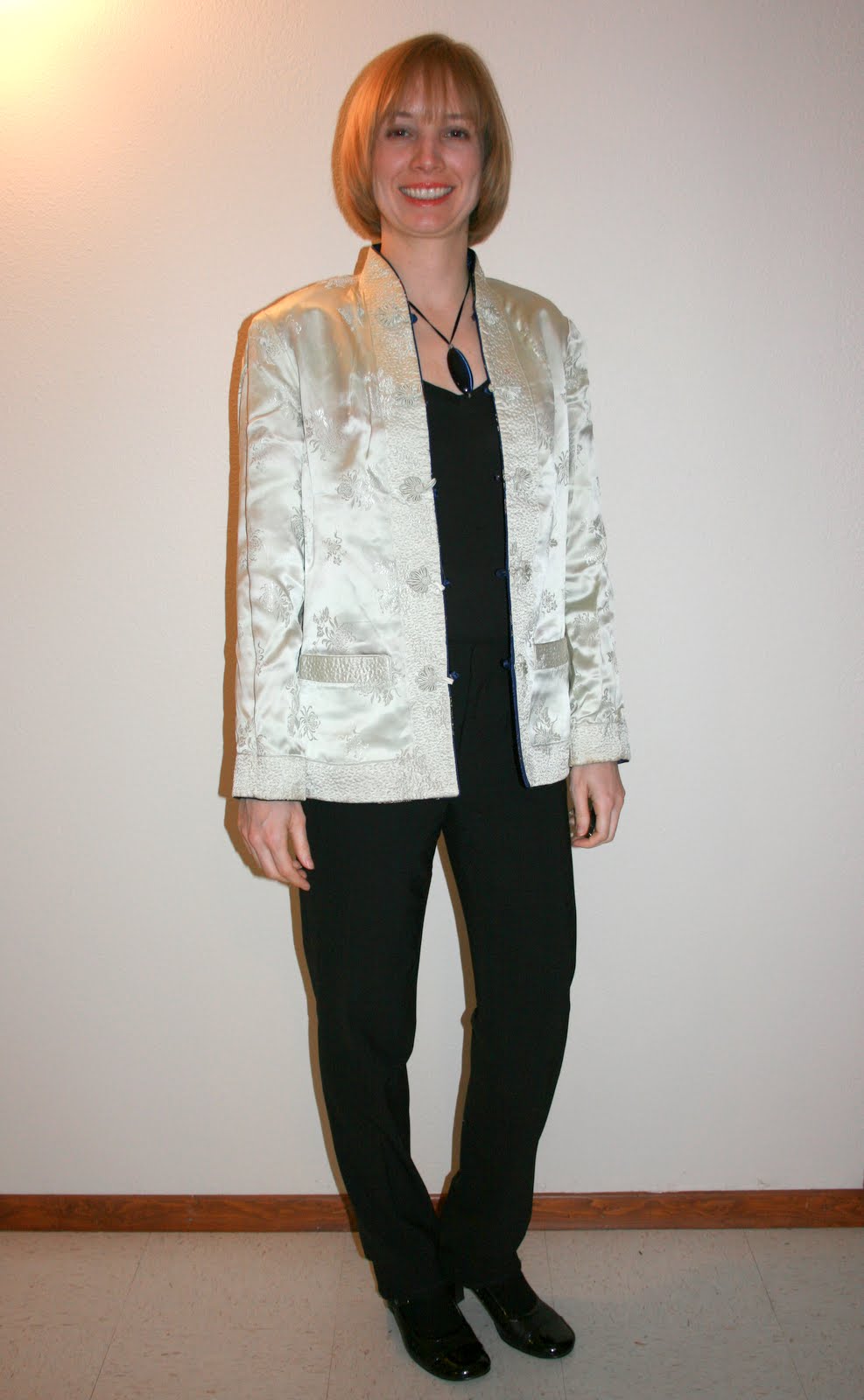 Asian Mandarin Collar Jacket - thrift find; Black slacks - Gap Boy Fit Trousers |